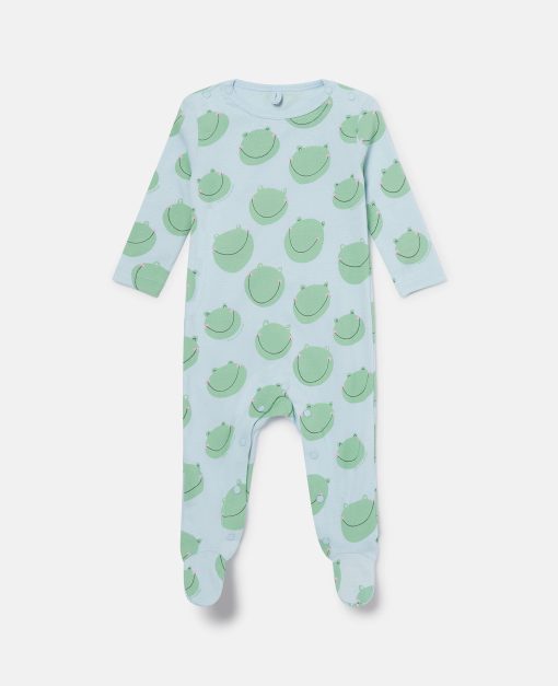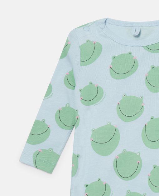 The Stella Kids Spring Summer 2025 collection playfully shows the next generation that animals are friends, not fashion. The season’s funny, froggy face is printed on this soft, organic cotton romper, hat and bib set.