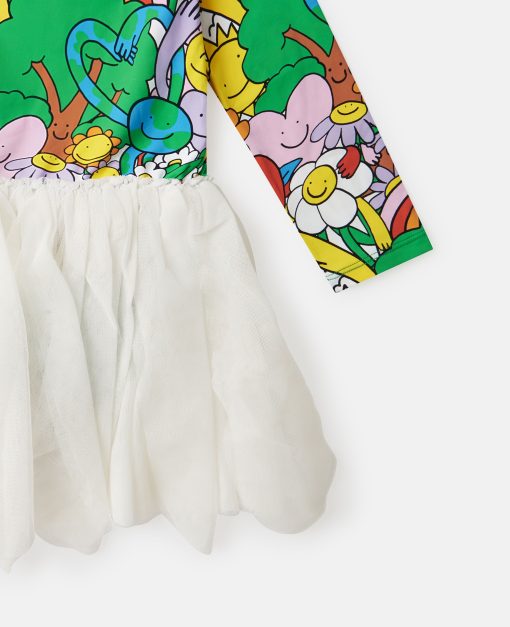 This dress is made from a stretchy blend of recycled nylon. For Fall/Winter 2025, Stella McCartney Kids is inspired by the love we have for our one shared home – Mother Earth. Smiling flowers, hearts and other earthy friends beam across a collection crafted from 96% conscious materials.
