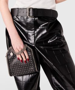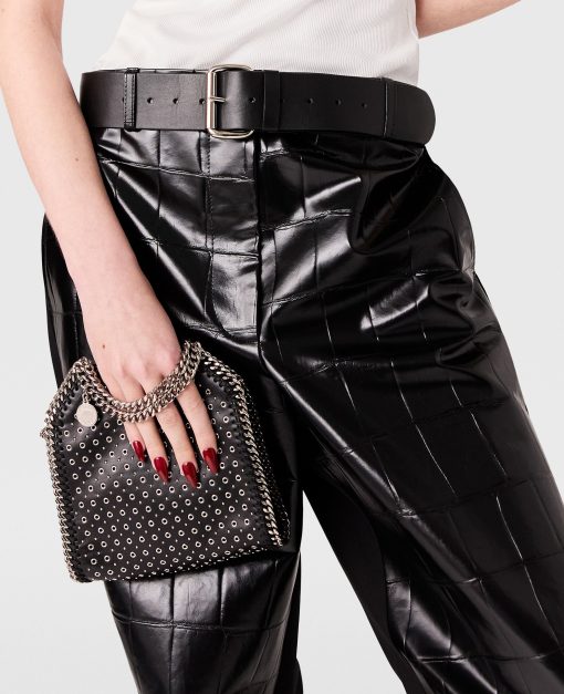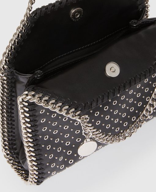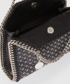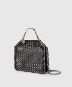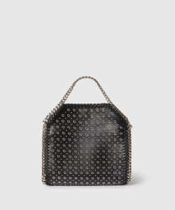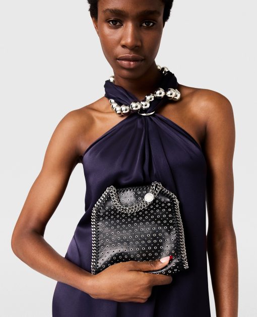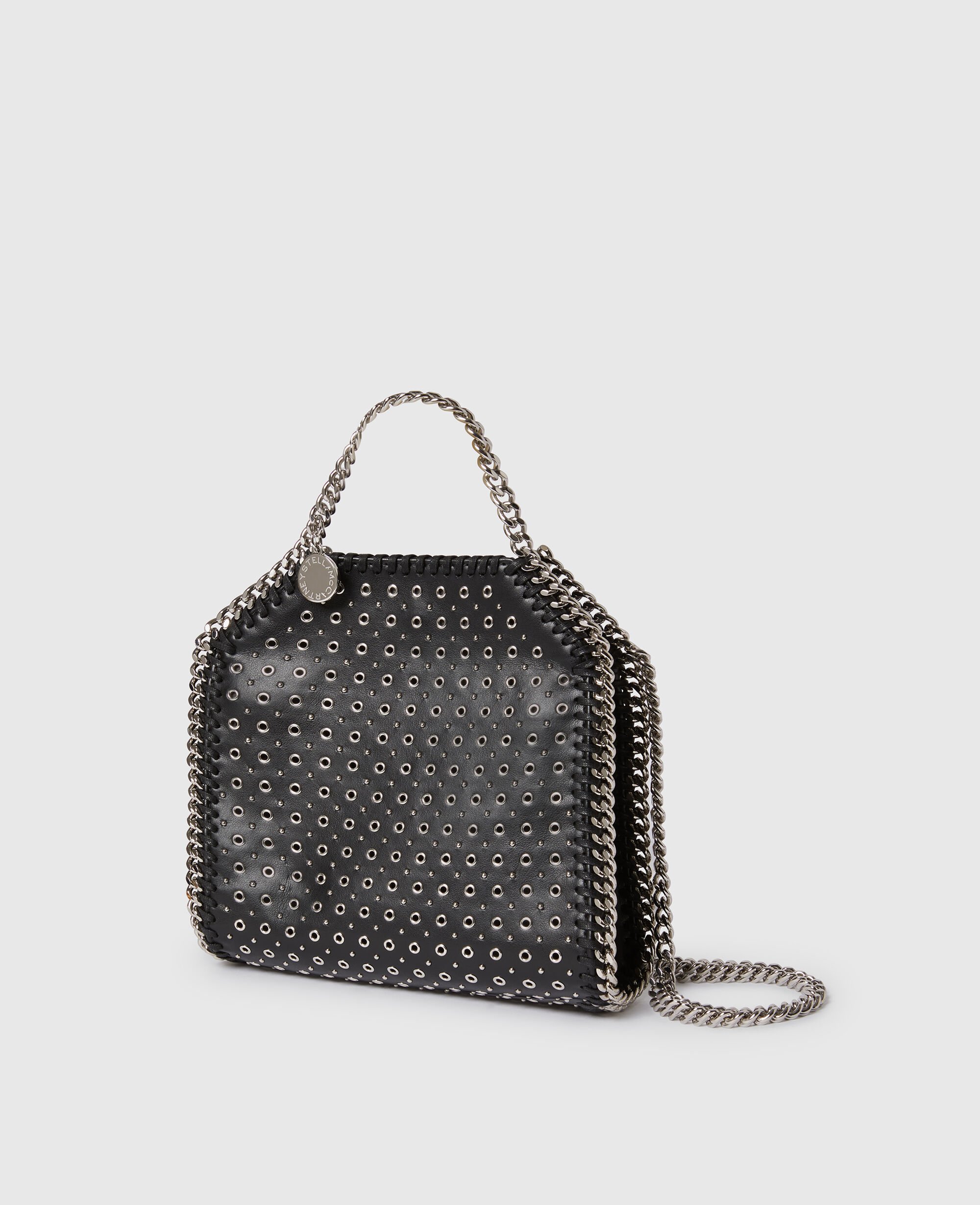 Add a rock edge to everyday dressing with this iconic Stella McCartney Falabella Tiny tote bag. Responsibly made from our vegan leather alternative hand-studded with eyelets, the tote bag is framed by a recycled brass and recyclable aluminum diamond-cut chain and is lined with recycled materials. There’s a slip pocket inside for smaller items, while the main compartment is roomy enough for keys, a phone and lipstick.