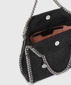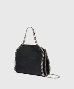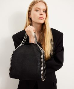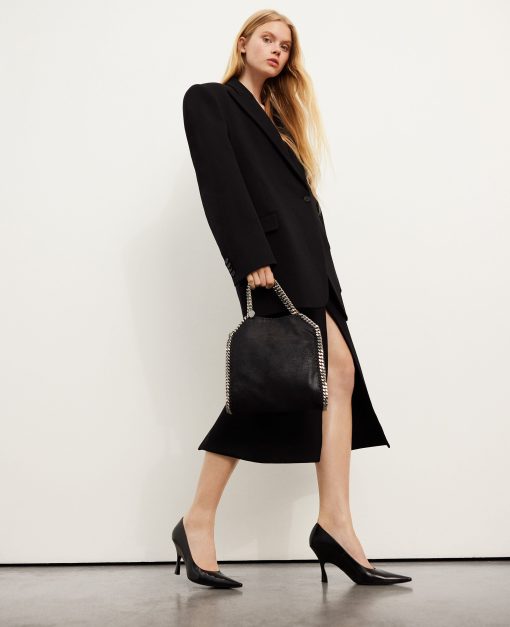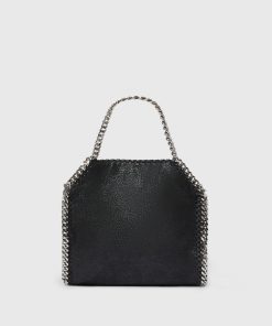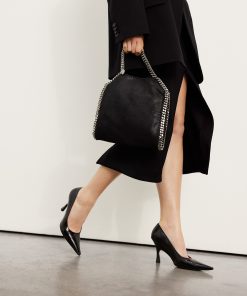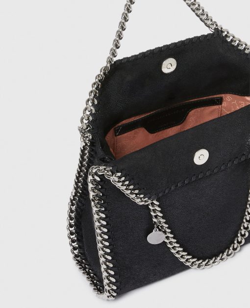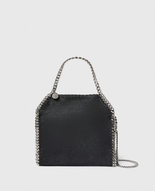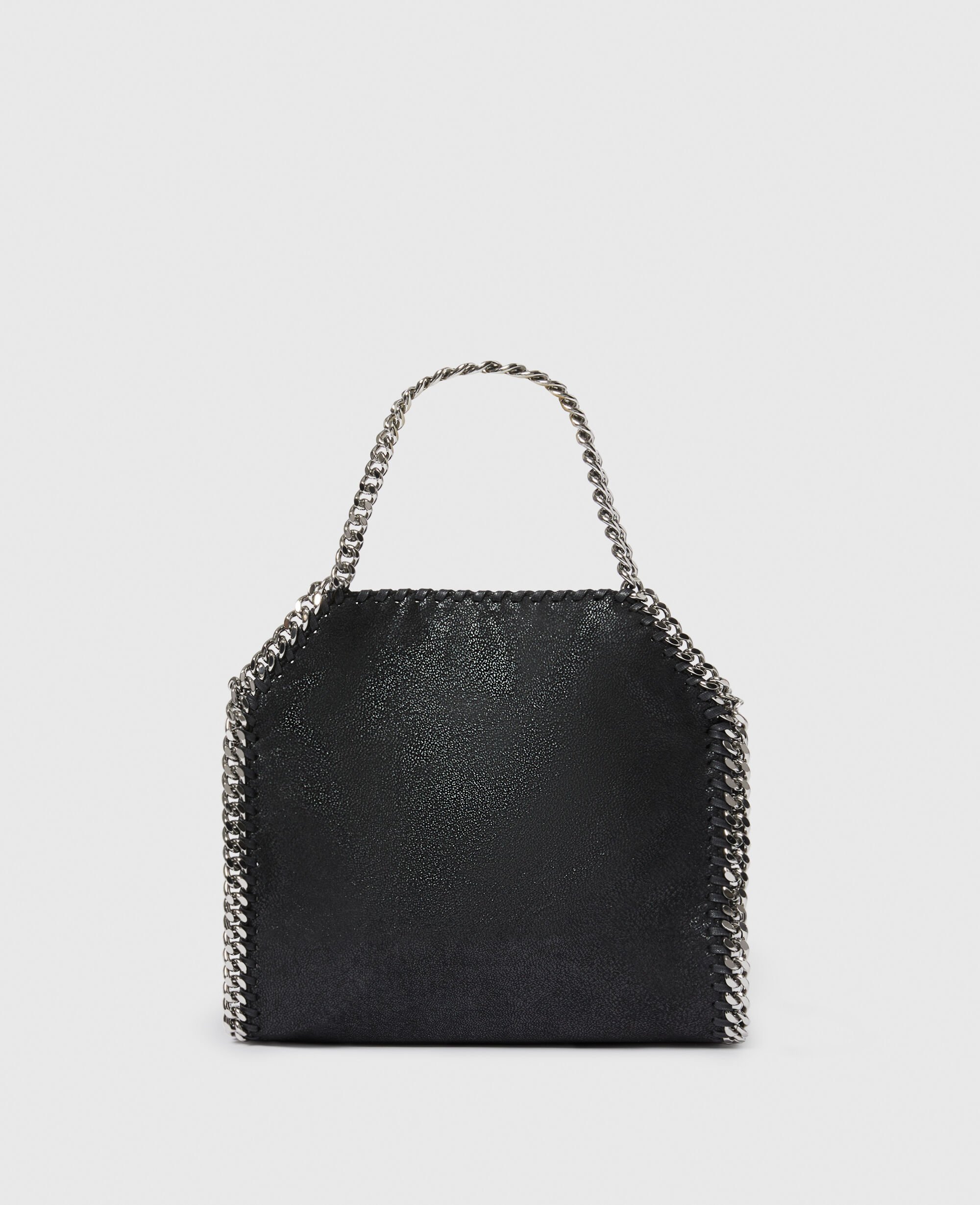 A daintier version of our iconic design, the Falabella mini tote bag is small but mighty. Consciously crafted from our grained vegan Shaggy Deer fabric and finished with a diamond-cut chain made from recycled brass and aluminium, this black tote has a handy inside slip pocket and a monogrammed lining made from post-consumer recycled polyester.