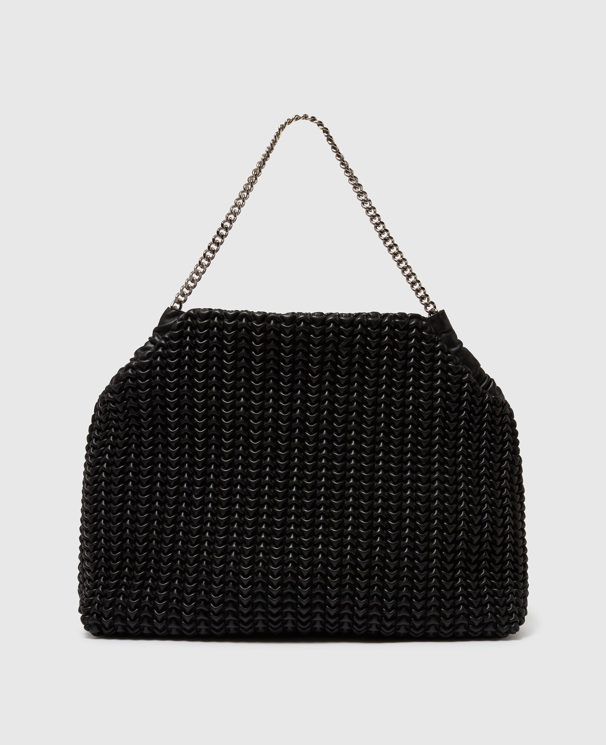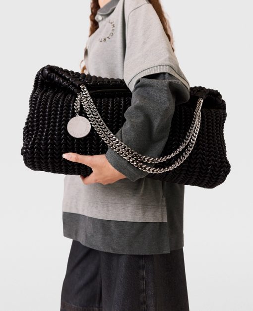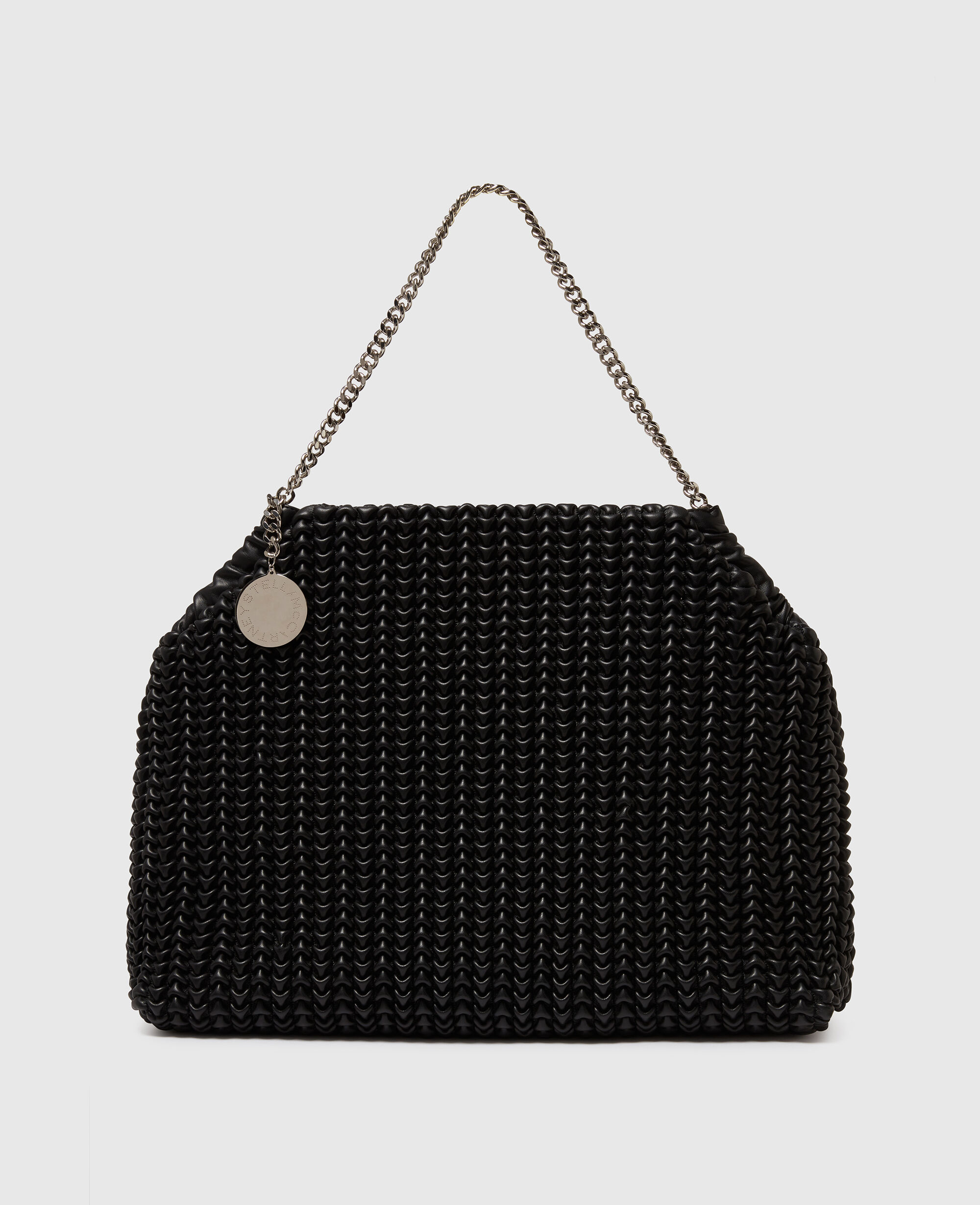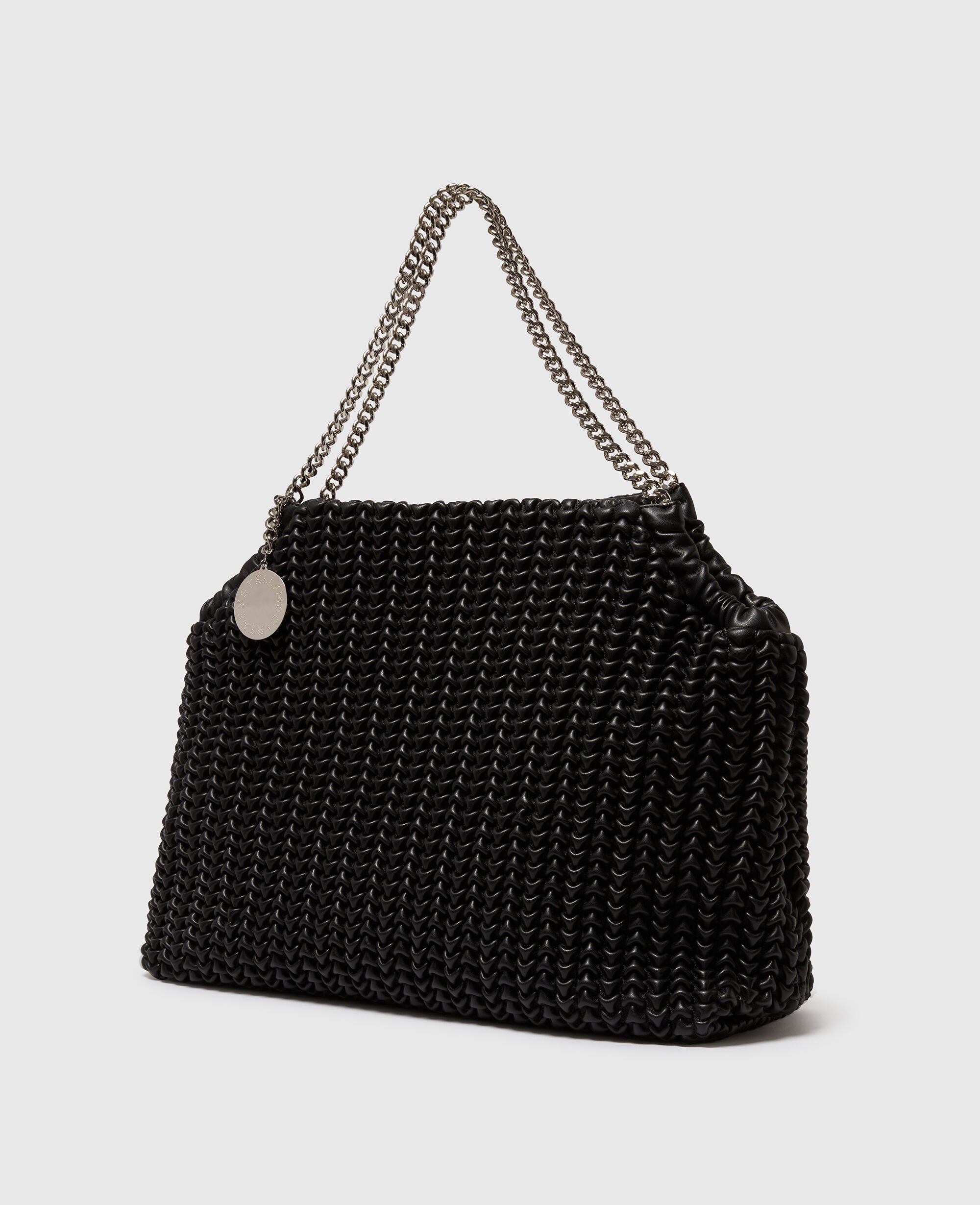 The new Falabella drawstring tote bag reimagines our vegan icon, with a tight, rippled popcorn-texture all-over. A signature diamond-cut recycled brass and recyclable aluminum chain serves as a shoulder strap, with enough room for your phone, wallet and daily essentials. Fully lined with monogrammed recycled fabric, wear it over the shoulder for a classic day-to-night look.