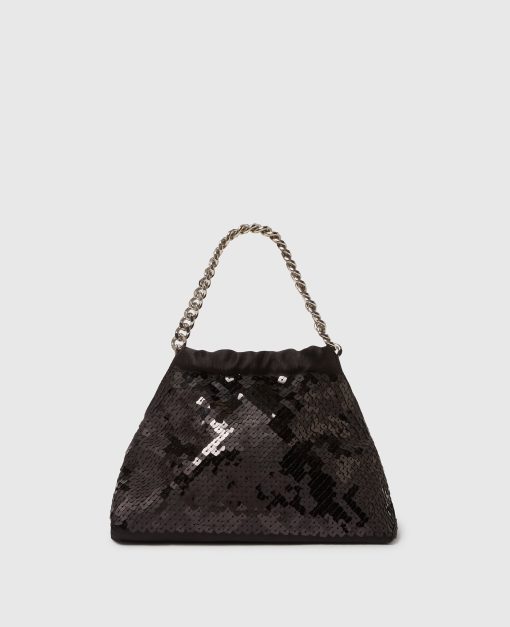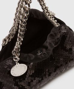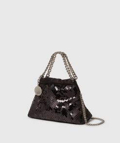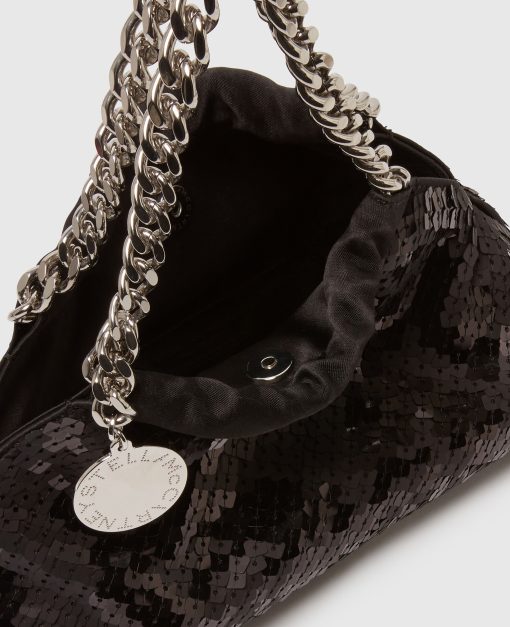 The new Falabella drawstring crossbody bag reimagines our vegan icon, with PVC-free, recycled polyester sequins all-over. Signature diamond-cut recycled brass and recyclable aluminum chains serve as two top handles and a crossbody strap, with enough room for your phone, wallet and daily essentials. Fully lined with monogrammed recycled fabric, wear it over the shoulder or sling it across your ensemble for a classic day-to-night look.