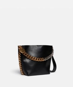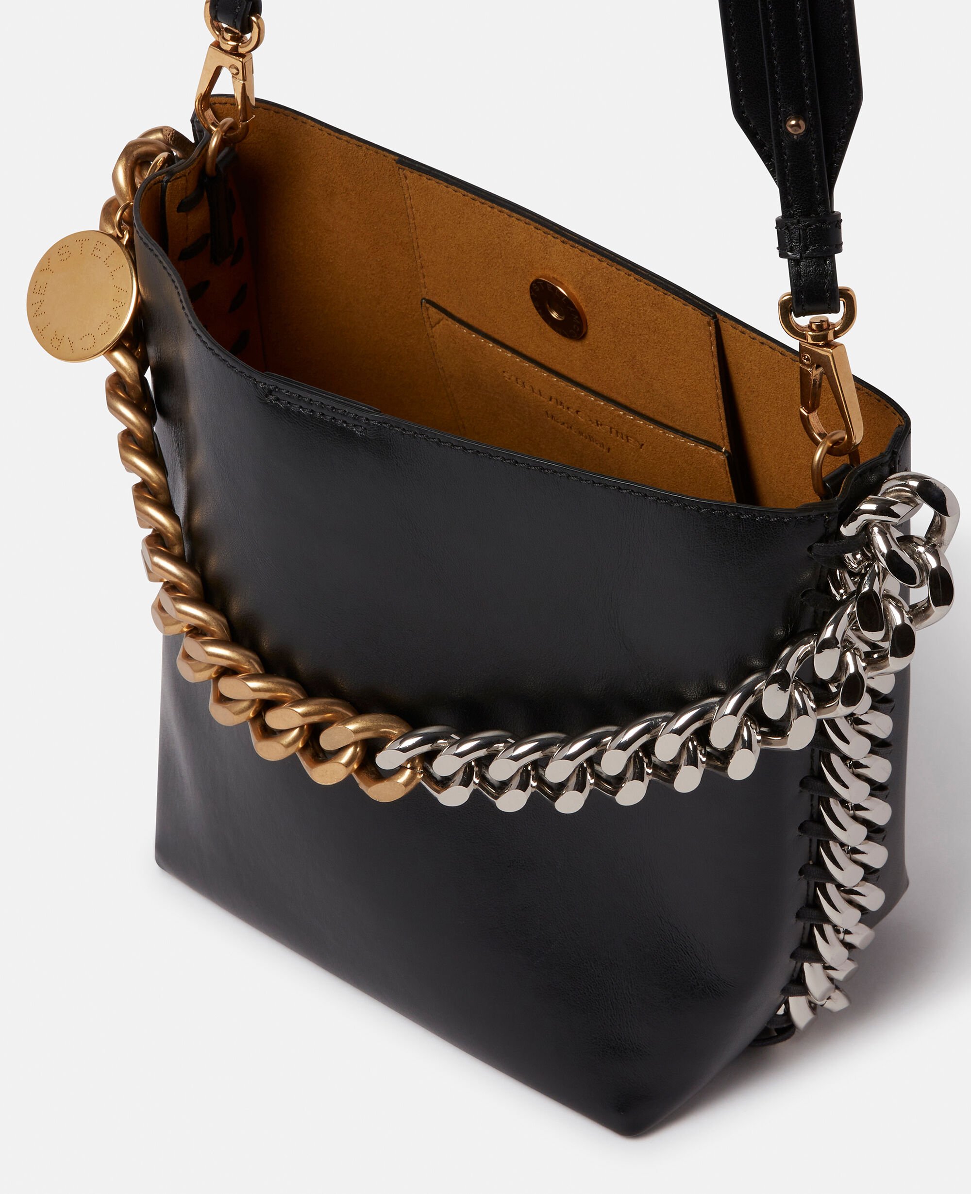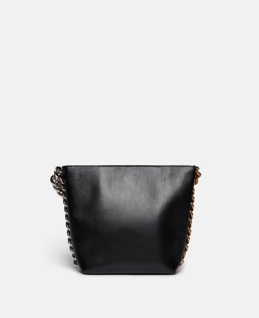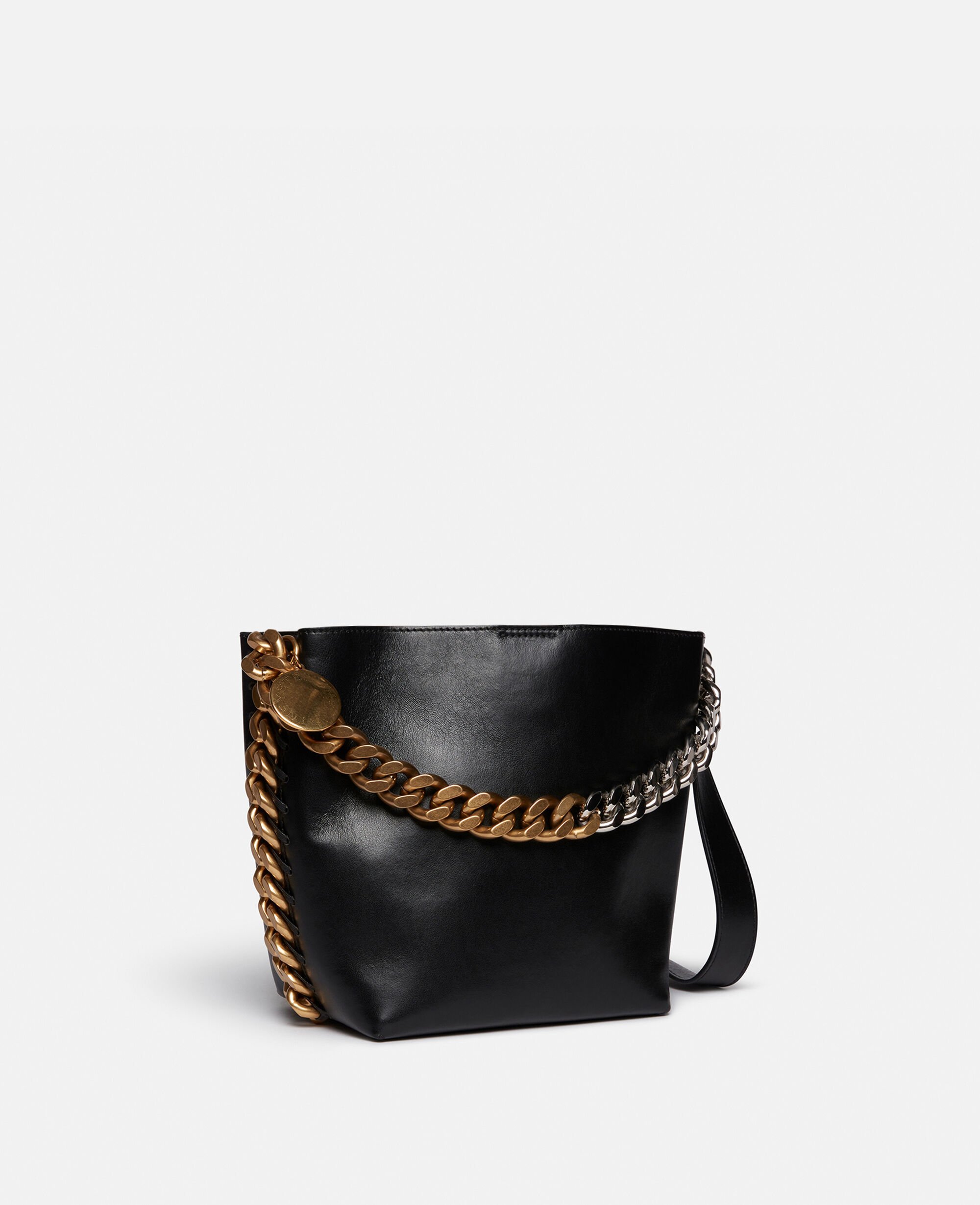 The soft structure of this Frayme bucket bag makes it a masterclass in wear-anytime appeal. Consciously crafted from smooth Alter Mat, our vegan alternative to animal leather, the bucket bag has an adjustable shoulder strap and an exaggerated version of our diamond-cut Falabella chain across its front.