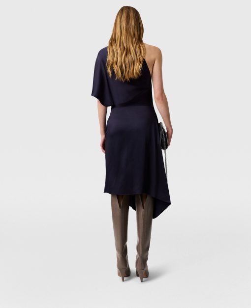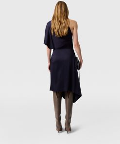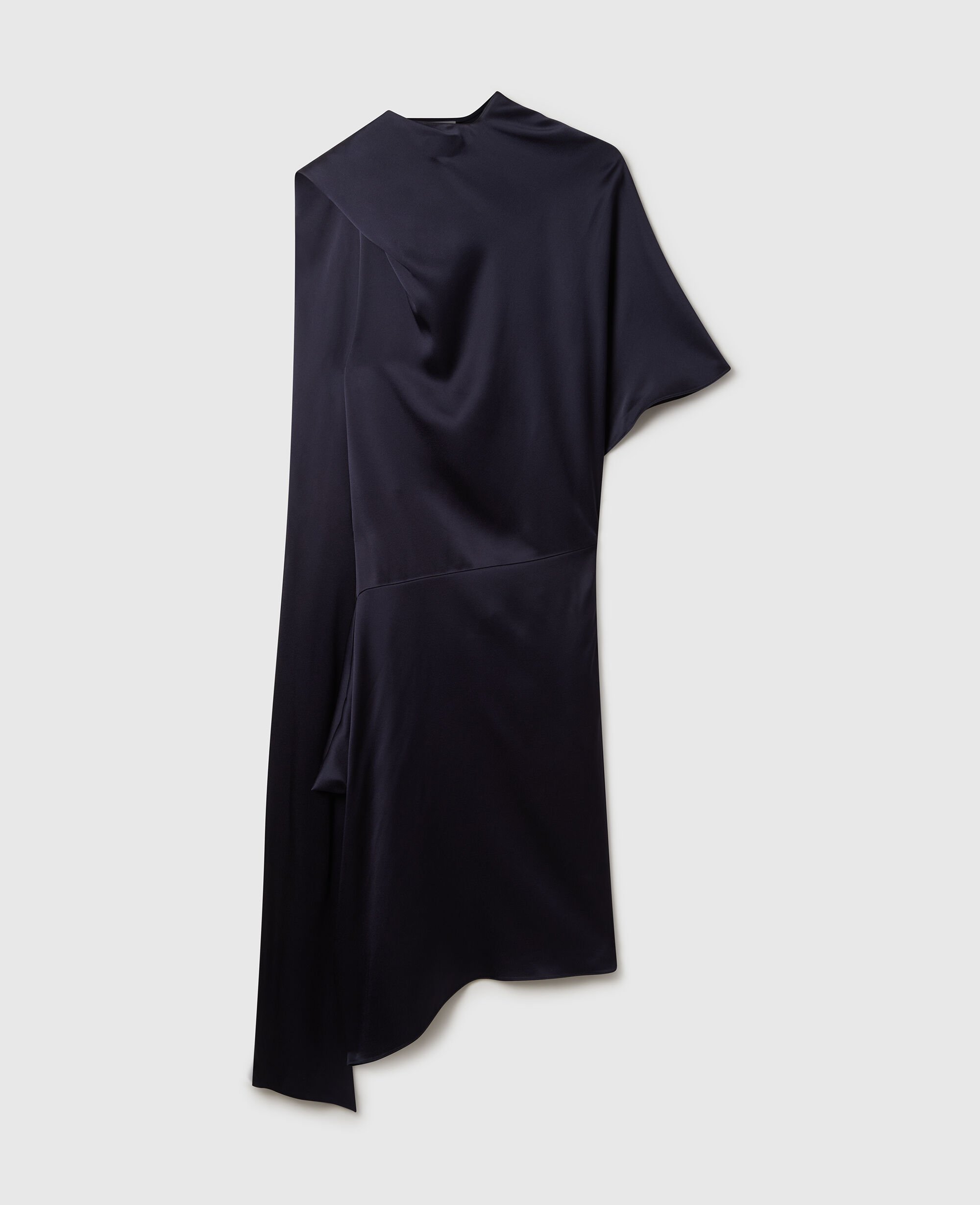 Draped in lustrous, forest-friendly viscose satin, this silky-smooth midi dress is defined by a tie panel wrapped around the neck. Cascading to an asymmetric hem that dances by the knees, it’s finished with a single, draped elbow-length sleeve.