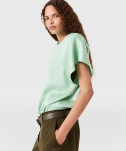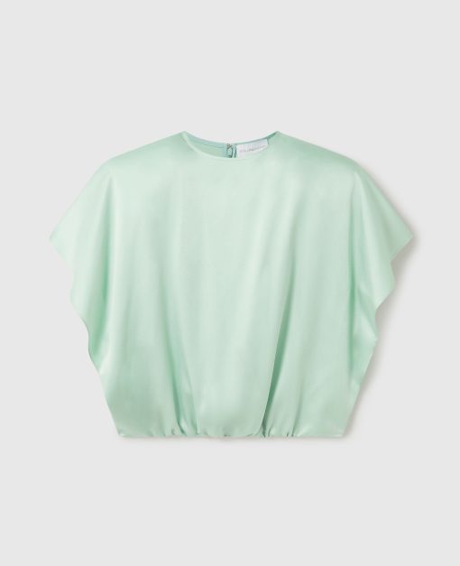 Spun from lustrous, forest-friendly viscose satin, this silky-smooth top begins with a crewneck and strong shoulders. Draping into a flowing, cap-sleeve silhouette that stops by the waist, it’s poised to elevate a pair of vintage-wash denim jeans.