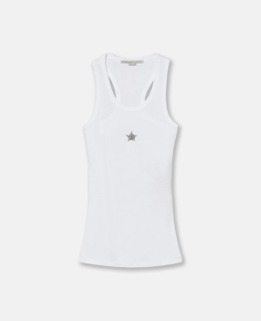Stars are in Stella McCartney’s design DNA. You will find this one set in glimmering lead-free crystals, front-and-center of this minimal, white cotton tank top. Slip it on with the iconic low-rise, cut-out jeans for a head-to-toe star-studded look.