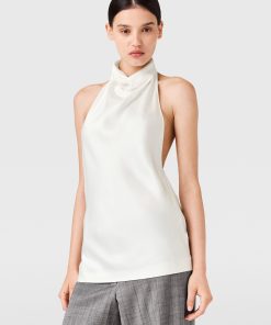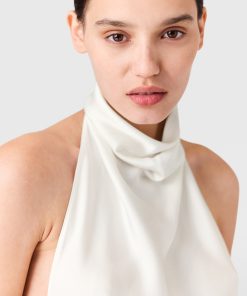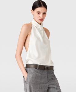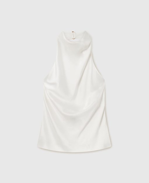 Spun from lustrous, forest-friendly viscose satin, this silky-smooth top begins wrapped around the neck. Draping into a flowing, clean-cut silhouette that stops by the waist, it’s poised to elevate a pair of vintage-wash denim jeans.