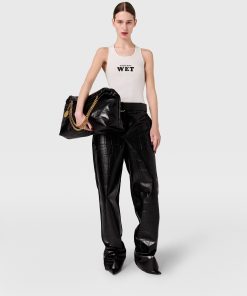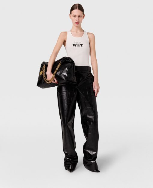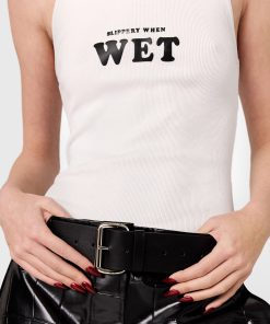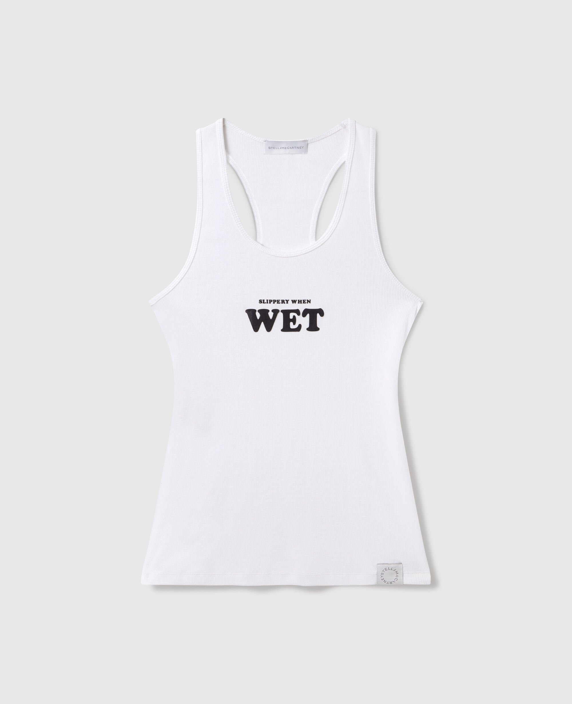 Spun from soft organic cotton jersey hugging closing to the body, this iconic Stella McCartney tank top is shaped to a classic racerback outline with Slippery When Wet on the front. It is printed in Algae Black™ by Living Ink, a carbon-negative, biobased black pigment repurposing algae waste.