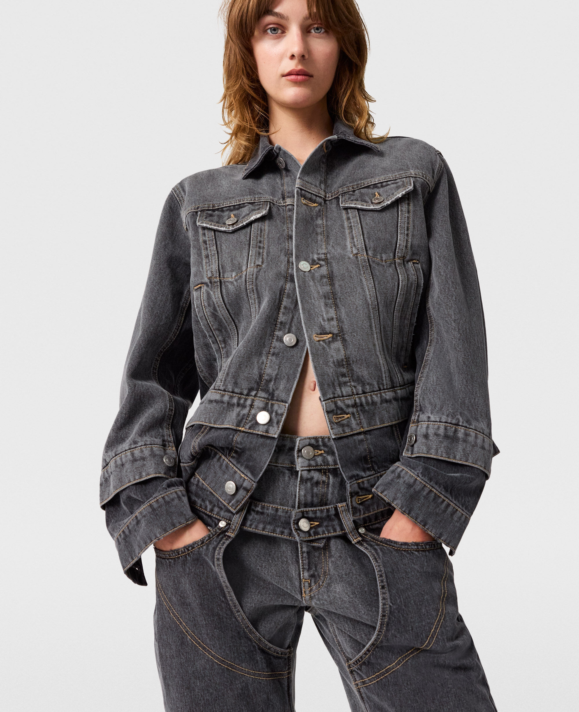 Crafted from organic cotton denim, this Stella McCartney jacket is cut to a classic long-sleeve, pointed-collar silhouette accented with tonal panels and distressed details. Pair it with the coordinating jeans.