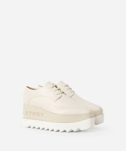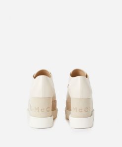 Tone-on-tone appeal reigns supreme with these cream Elyse platform shoes. A studded Stella McCartney logo on the signature wedge heel adds a mischievous wink, ideal for teaming with tailored two-pieces.